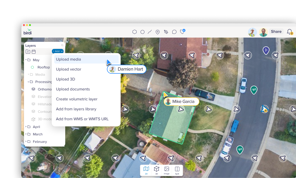 Upload drone or aerial photos, 360° captures, or ground-based imagery. Birdi processes your raw files into accurate maps and 3D models. You can even bring in your own datasets, vectors, or publicly available maps for full context.